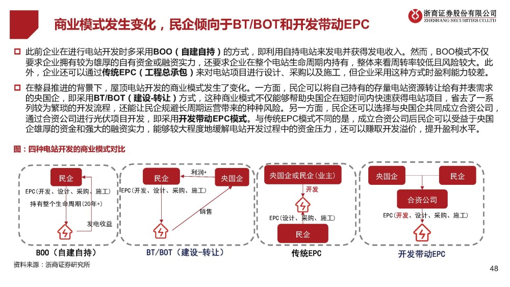 此前企业在进行电站开发时多采用BOO(自建自持)的方式,即利用自持电站来发电并获得发电收入。然而,BOO模式不仅 要求企业拥有较为雄厚的自有资金或融资实力,还要求企业在整个电站生命周期内持有,整体来看周转率较低且风险较大。此 外,企业还可以通过传统EPC(工程总承包)来对电站项目进行设计、采购以及施工,但企业采用这种方式时盈利能力较差。