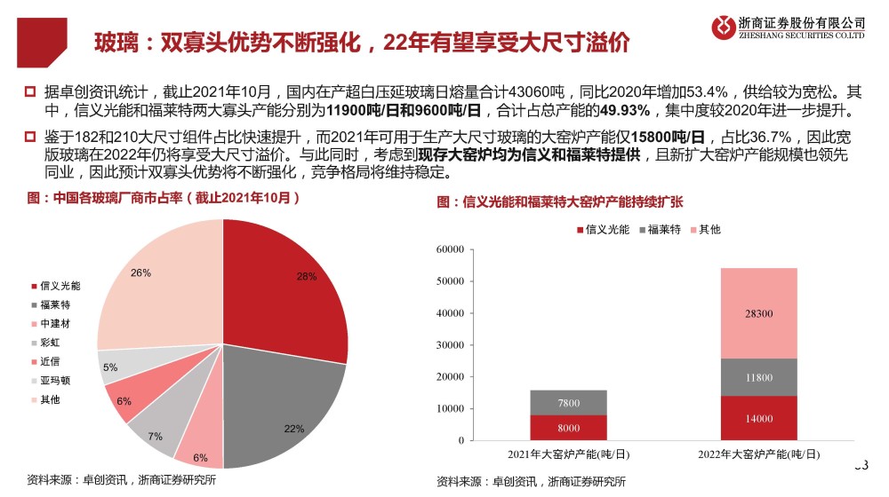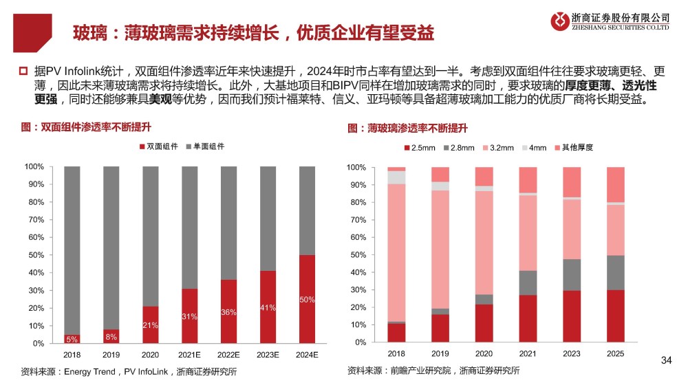 据PV Infolink统计,双面组件渗透率近年来快速提升,2024年时市占率有望达到一半。考虑到双面组件往往要求玻璃更轻、更 薄,因此未来薄玻璃需求将持续增长。此外,大基地项目和BIPV同样在增加玻璃需求的同时,要求玻璃的厚度更薄、透光性 更强,同时还能够兼具美观等优势,因而我们预计福莱特、信义、亚玛顿等具备超薄玻璃加工能力的优质厂商将长期受益。