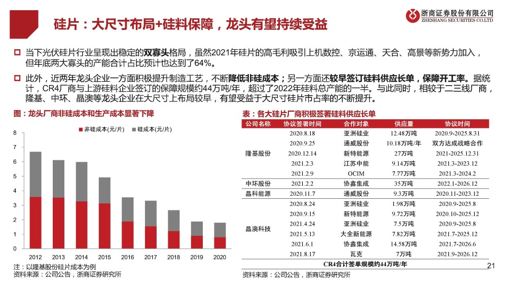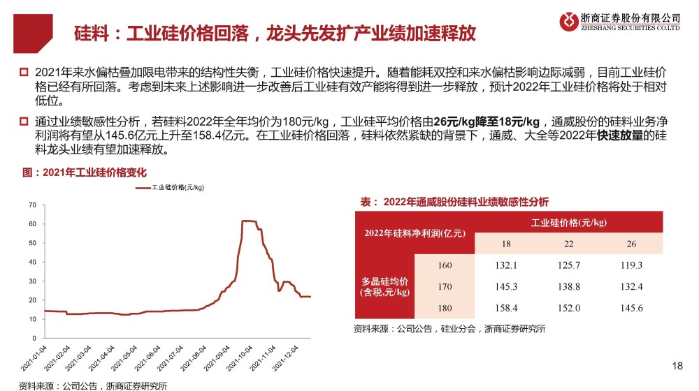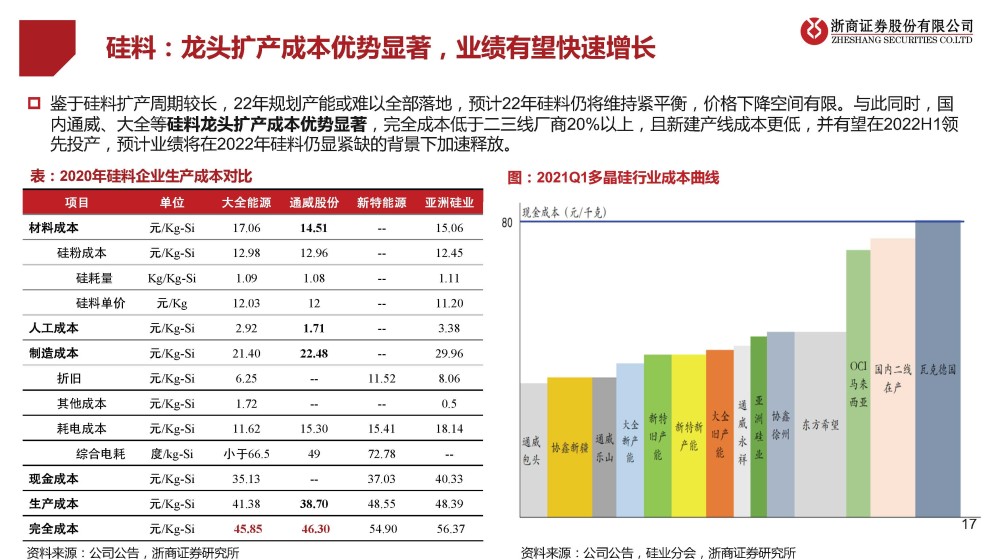 鉴于硅料扩产周期较长,22年规划产能或难以全部落地,预计22年硅料仍将维持紧平衡,价格下降空间有限。与此同时,国 内通威、大全等硅料龙头扩产成本优势显著,完全成本低于二三线厂商20%以上,且新建产线成本更低,并有望在2022H1领 先投产,预计业绩将在2022年硅料仍显紧缺的背景下加速释放。
