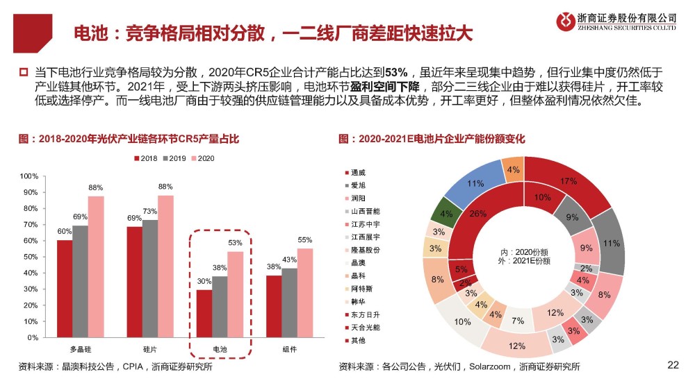 当下电池行业竞争格局较为分散,2020年CR5企业合计产能占比达到53%,虽近年来呈现集中趋势,但行业集中度仍然低于 产业链其他环节。2021年,受上下游两头挤压影响,电池环节盈利空间下降,部分二三线企业由于难以获得硅片,开工率较 低或选择停产。而一线电池厂商由于较强的供应链管理能力以及具备成本优势,开工率更好,但整体盈利情况依然欠佳。
