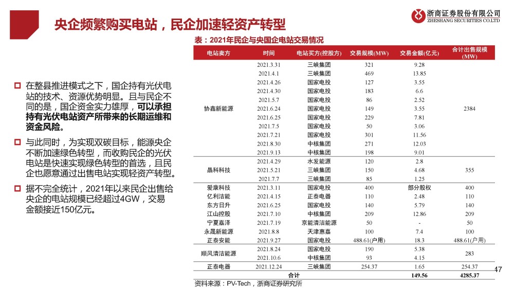 在整县推进模式之下,国企持有光伏电 站的技术、资源优势明显。且与民企不 同的是,国企资金实力雄厚,可以承担 持有光伏电站资产所带来的长期运维和 资金风险。