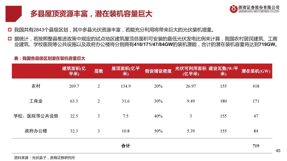 我国共有2843个县级区划,其中多县光伏资源丰富,若能充分利用将带来巨大的光伏装机增量。据统计,若按照整县推进政策中规定的试点地区建筑屋顶总面积可安装的最低光伏发电比例来计算,我国农村居民建筑、工商 业建筑、学校医院等公共设施以及政府办公楼将分别拥有418/171/47/84GW的装机潜能,合计的潜在装机容量将达到719GW。
