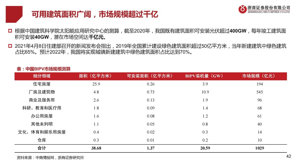 根据中国建筑科学院太阳能应用研究中心的测算,截至2020年,我国既有建筑面积可安装光伏超过400GW,每年竣工建筑面 积可安装40GW,潜在市场空间达千亿元。2021年4月8日住建部召开的新闻发布会指出,2019年全国累计建设绿色建筑面积超过50亿平方米,当年新建建筑中绿色建筑 占比65%。预计2022年,我国将实现城镇新建建筑中绿色建筑面积占比达到70%。
