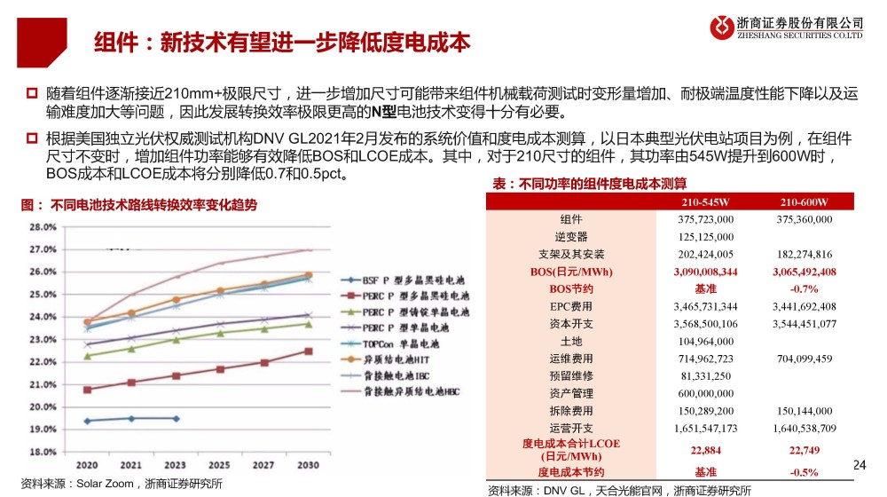 随着组件逐渐接近210mm+极限尺寸,进一步增加尺寸可能带来组件机械载荷测试时变形量增加、耐极端温度性能下降以及运 输难度加大等问题,因此发展转换效率极限更高的N型电池技术变得十分有必要。根据美国独立光伏权威测试机构DNV GL2021年2月发布的系统价值和度电成本测算,以日本典型光伏电站项目为例,在组件 尺寸不变时,增加组件功率能够有效降低BOS和LCOE成本。其中,对于210尺寸的组件,其功率由545W提升到600W时, BOS成本和LCOE成本将分别降低0.7和0.5pct。