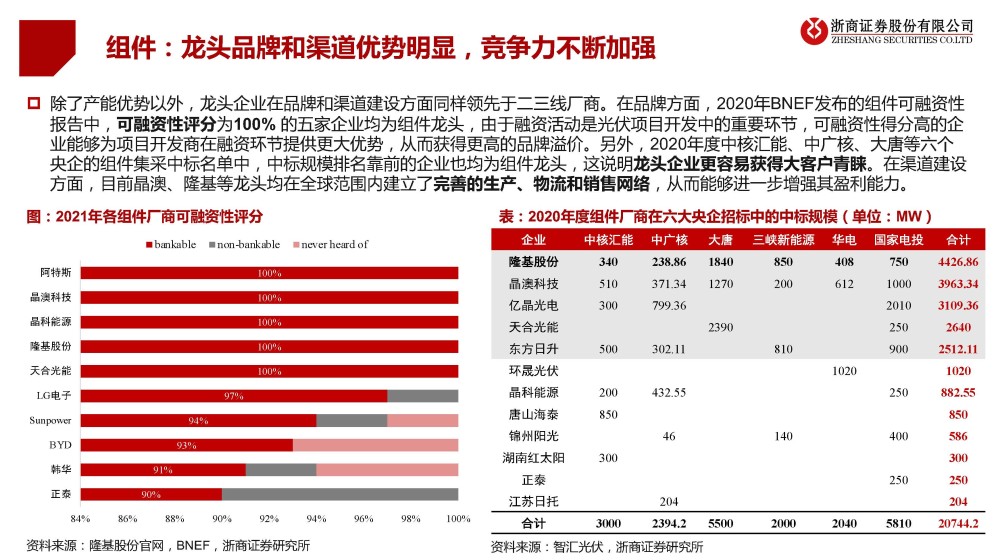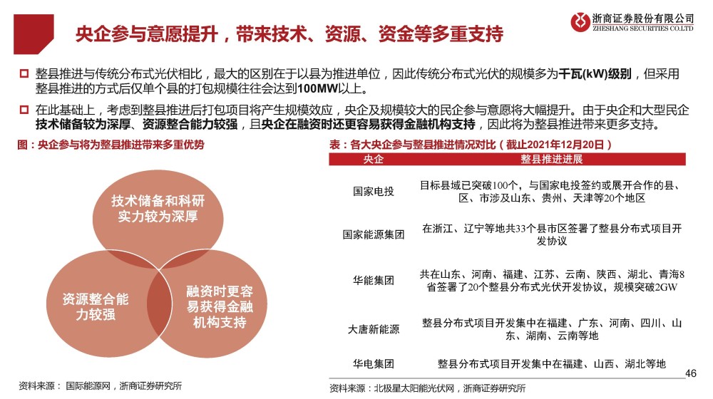 整县推进与传统分布式光伏相比,最大的区别在于以县为推进单位,因此传统分布式光伏的规模多为千瓦(kW)级别,但采用 整县推进的方式后仅单个县的打包规模往往会达到100MW以上。在此基础上,考虑到整县推进后打包项目将产生规模效应,央企及规模较大的民企参与意愿将大幅提升。由于央企和大型民企 技术储备较为深厚、资源整合能力较强,且央企在融资时还更容易获得金融机构支持,因此将为整县推进带来更多支持。