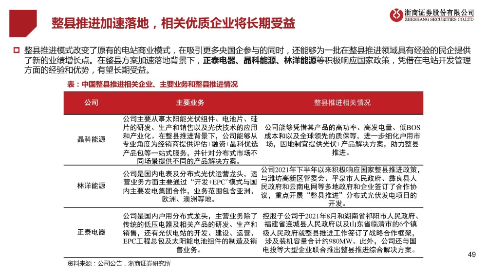 整县推进模式改变了原有的电站商业模式,在吸引更多央国企参与的同时,还能够为一批在整县推进领域具有经验的民企提供 了新的业绩增长点。在整县方案加速落地背景下,正泰电器、晶科能源、林洋能源等积极响应国家政策,凭借在电站开发管理 方面的经验和优势,有望长期受益。