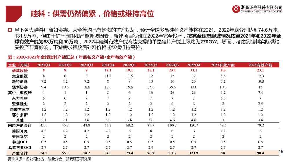 当下各大硅料厂商如协鑫、大全等均已有饱满的扩产规划,预计全球多晶硅名义产能将在2021、2022年底分别达到74.6万吨、 131.9万吨。但由于扩产周期和产能爬坡因素,新建项目很难在2022年完全投产,按完全理想爬坡情况估算2021年和2022年全 球有效产能为58万吨和90万吨,2022年硅料有效产能将能支撑的单晶硅片产能上限约为270GW。然而,考虑到硅料实际供给 受投产节奏影响,下游需求释放后硅料价格或继续维持高位。