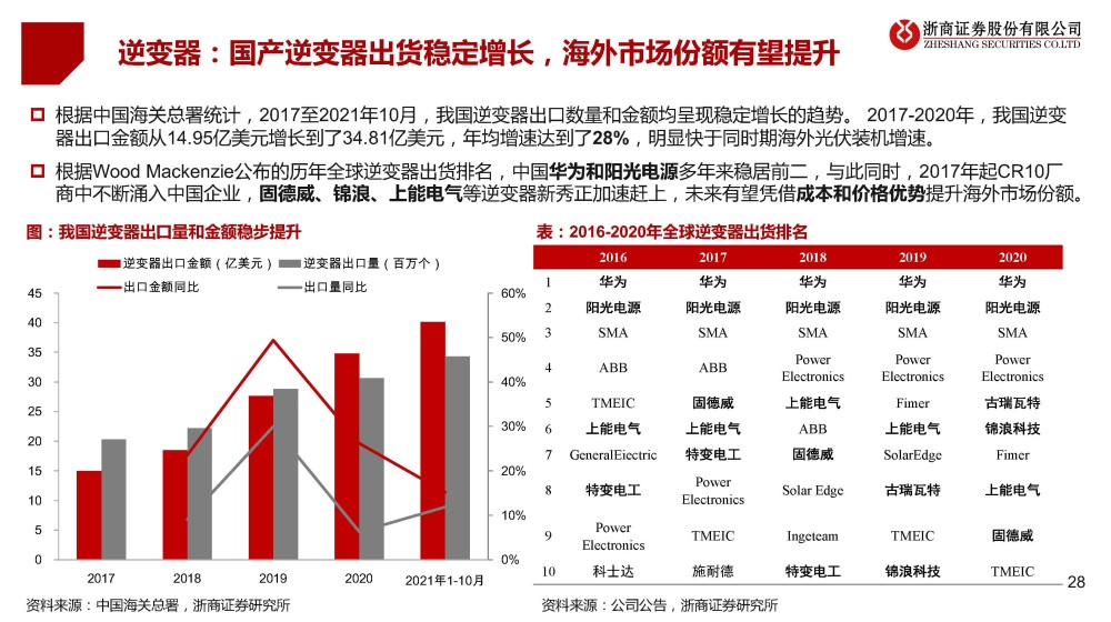 根据中国海关总署统计,2017至2021年10月,我国逆变器出口数量和金额均呈现稳定增长的趋势。 2017-2020年,我国逆变器出口金额从14.95亿美元增长到了34.81亿美元,年均增速达到了28%,明显快于同时期海外光伏装机增速。根据Wood Mackenzie公布的历年全球逆变器出货排名,中国华为和阳光电源多年来稳居前二,与此同时,2017年起CR10厂 商中不断涌入中国企业,固德威、锦浪、上能电气等逆变器新秀正加速赶上,未来有望凭借成本和价格优势提升海外市场份额。