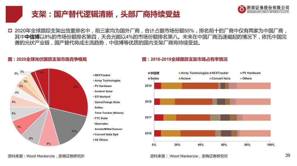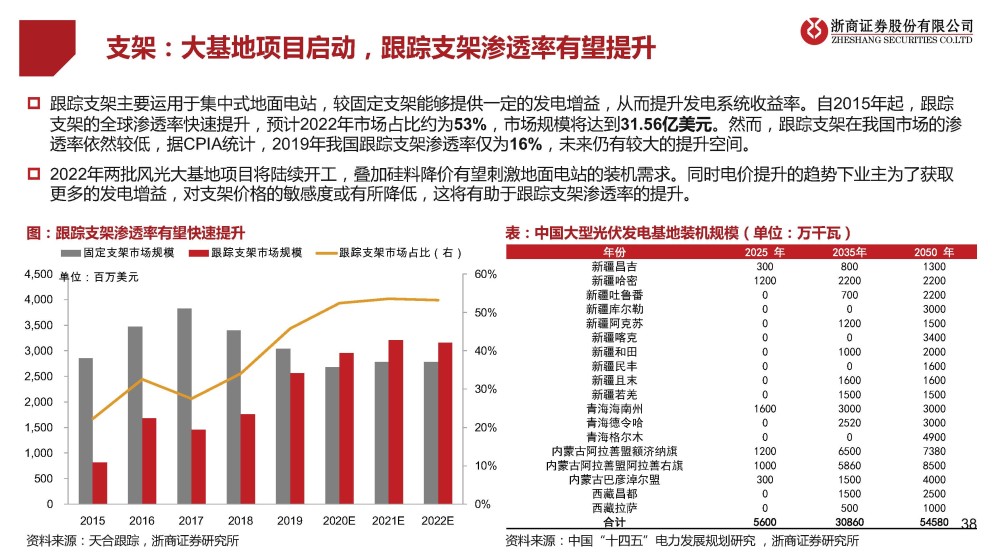 跟踪支架主要运用于集中式地面电站,较固定支架能够提供一定的发电增益,从而提升发电系统收益率。自2015年起,跟踪 支架的全球渗透率快速提升,预计2022年市场占比约为53%,市场规模将达到31.56亿美元。然而,跟踪支架在我国市场的渗 透率依然较低,据CPIA统计,2019年我国跟踪支架渗透率仅为16%,未来仍有较大的提升空间。2022年两批风光大基地项目将陆续开工,叠加硅料降价有望刺激地面电站的装机需求。同时电价提升的趋势下业主为了获取 更多的发电增益,对支架价格的敏感度或有所降低,这将有助于跟踪支架渗透率的提升。