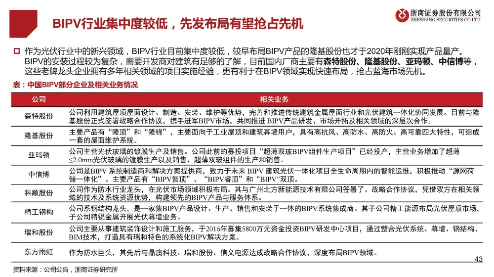 作为光伏行业中的新兴领域,BIPV行业目前集中度较低,较早布局BIPV产品的隆基股份也才于2020年刚刚实现产品量产。 BIPV的安装过程较为复杂,需要开发商对建筑有足够的了解,目前国内厂商主要有森特股份、隆基股份、亚玛顿、中信博等, 这些老牌龙头企业拥有多年相关领域的项目实施经验,更有利于在BIPV领域实现快速布局,抢占蓝海市场先机。