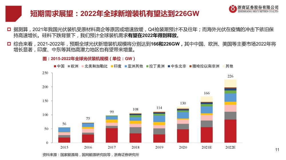 据测算,2021年我国光伏装机受原材料高企等原因或增速放缓,Q4抢装潮预计不及往年;而海外光伏在疫情的冲击下依旧保 持高速增长。硅料下跌背景下,我们预计全球装机需求有望在2022年得到释放。综合来看,2021-2022年,预期全球光伏新增装机规模将分别达到166和226GW,其中中国、欧洲、美国等主要市场2022年将 增长显著,印度、中东等其他高潜力地区也有望带来增量。